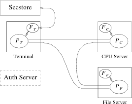![]() Figure 1a. Components of the security architecture. Each box is a (typically) separate machine; each ellipse a process. The ellipses labeled FX are factotum processes; those labeled PX are the pieces and proxies of a distributed program. The authentication server is one of several repositories for users’ security information that factotum processes consult as required. Secstore is a shared resource for storing private information such as keys; factotum consults it for the user during bootstrap. |